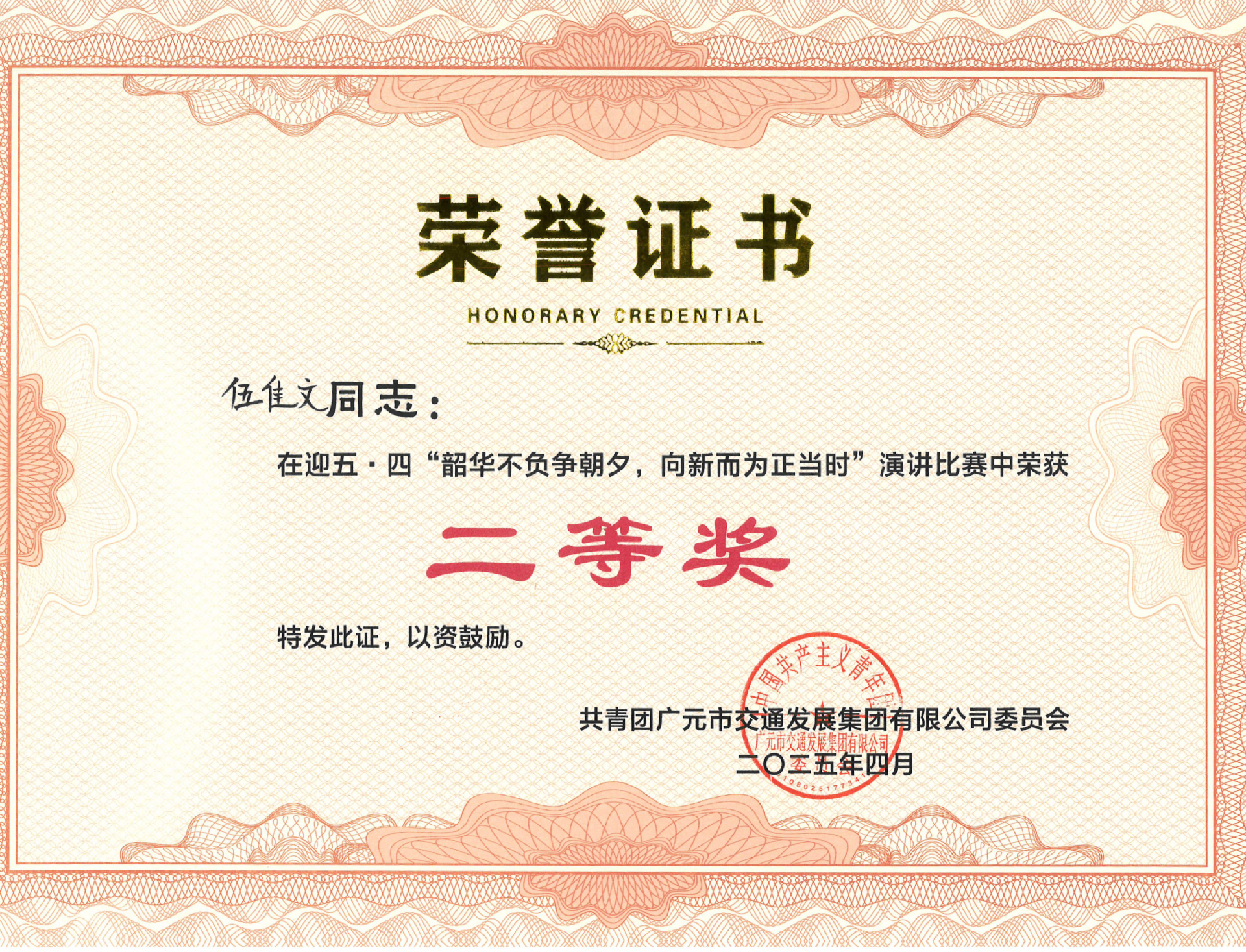 憑借極具感染力的舞臺表現(xiàn)和真摯動人的內(nèi)容表達,伍佳文同志從眾多選手中脫穎而出,榮獲二等獎佳績。
